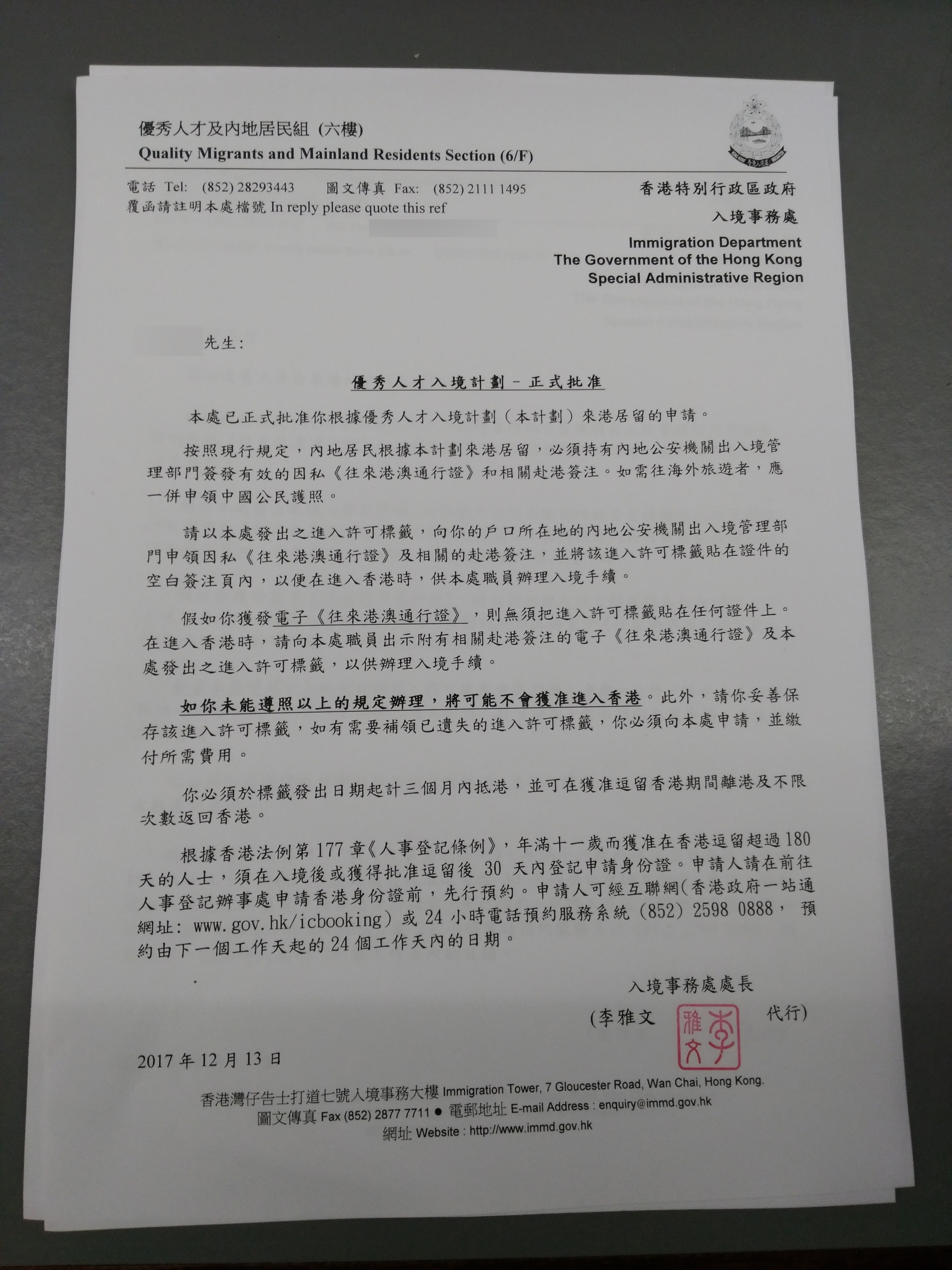 2、2016年07月20日收到入境處信函要求補交相關(guān)文件。