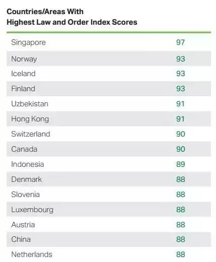 2018年美國(guó)民意調(diào)查公司蓋洛普公布了最新的《全球法律與秩序報(bào)告》(2018 Global Law and Order report)。該報(bào)告根據(jù)全球142個(gè)國(guó)家和地區(qū)的居民反饋,基于居民自身的安全感,對(duì)全球各地的地點(diǎn)進(jìn)行了排名,得分越高,說(shuō)明安全系數(shù)越高。新加坡以97分排名第 一,然后是挪威、冰島、 芬蘭以93分并列第二至四位。這一點(diǎn)可以說(shuō)是全球許多移民人士選擇移居新加坡的一個(gè)主要原因。