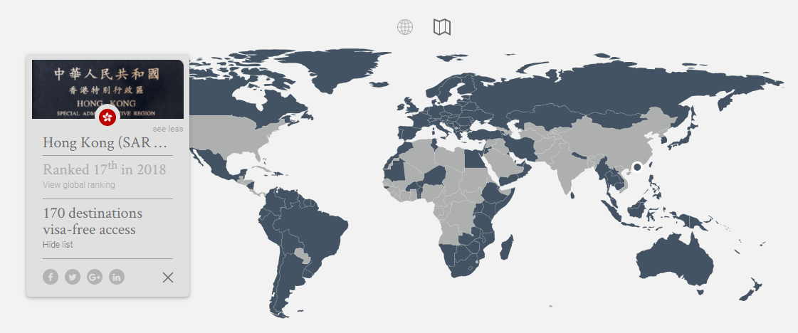截止2018年11月,中國香港護(hù)照位列全球護(hù)照含金量排行榜第17名,免簽或落地簽國家及地區(qū)共170個(gè),香港免簽國家及地區(qū)如下: