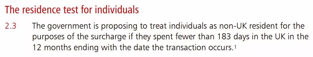對(duì)于個(gè)人買家來說,以房產(chǎn)交易日往前推12個(gè)月(一年),如果在這一年內(nèi),個(gè)人買家在英國(guó)居住的時(shí)間少于183天,即為“海外買家”,需要支付額外印花稅。