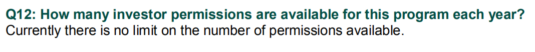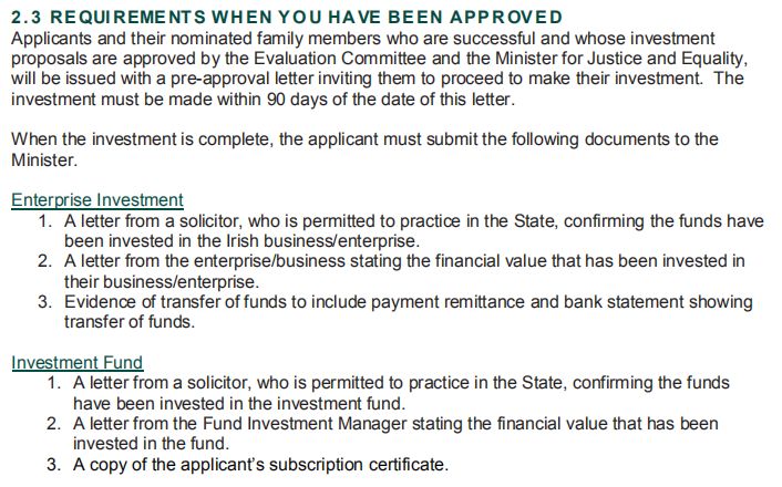 除了再次重申不得融資以外,此次法案更新還首次提到了“預(yù)批復(fù)”環(huán)節(jié),即投資人的投資申請由評估委員會(Evaluation Committee)和愛爾蘭司法和平等部長( The Minister for Justice and Equality)批準(zhǔn)后將獲得“預(yù)批函”(Pre-approval letter)。