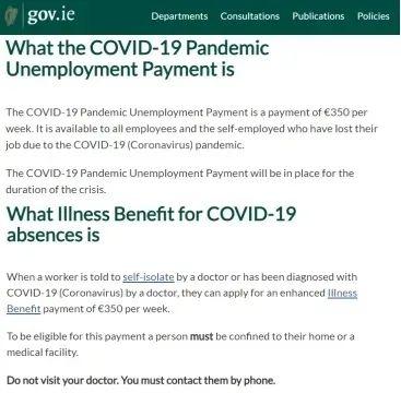 愛爾蘭福利局為所有因疫情而失去收入的員工或自雇人士每人每周350歐元,共計(jì)發(fā)放6周的基本補(bǔ)助金。申請?jiān)撗a(bǔ)助不會對簽證造成影響。